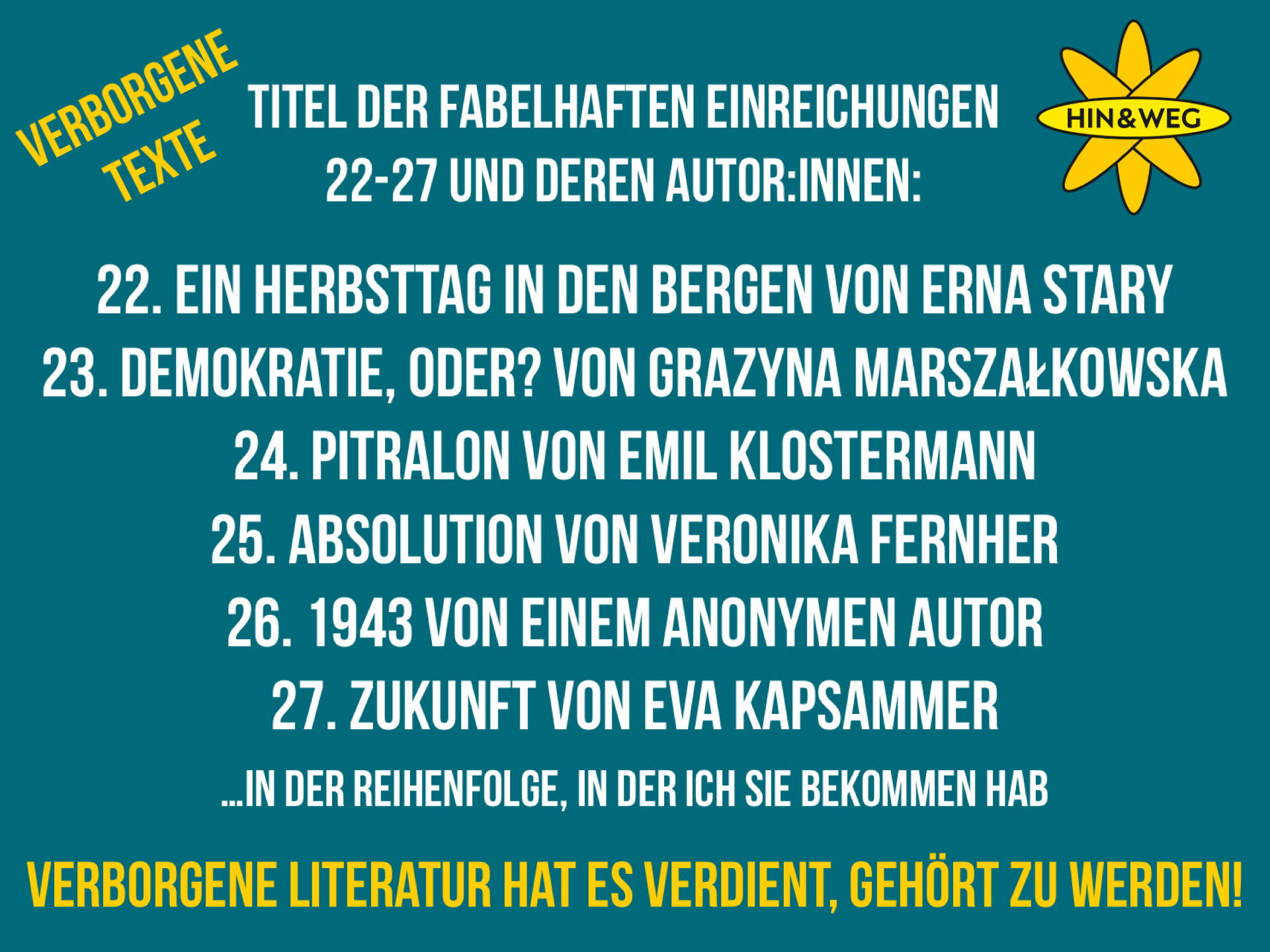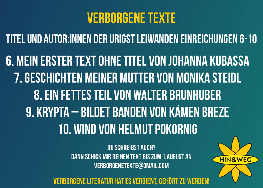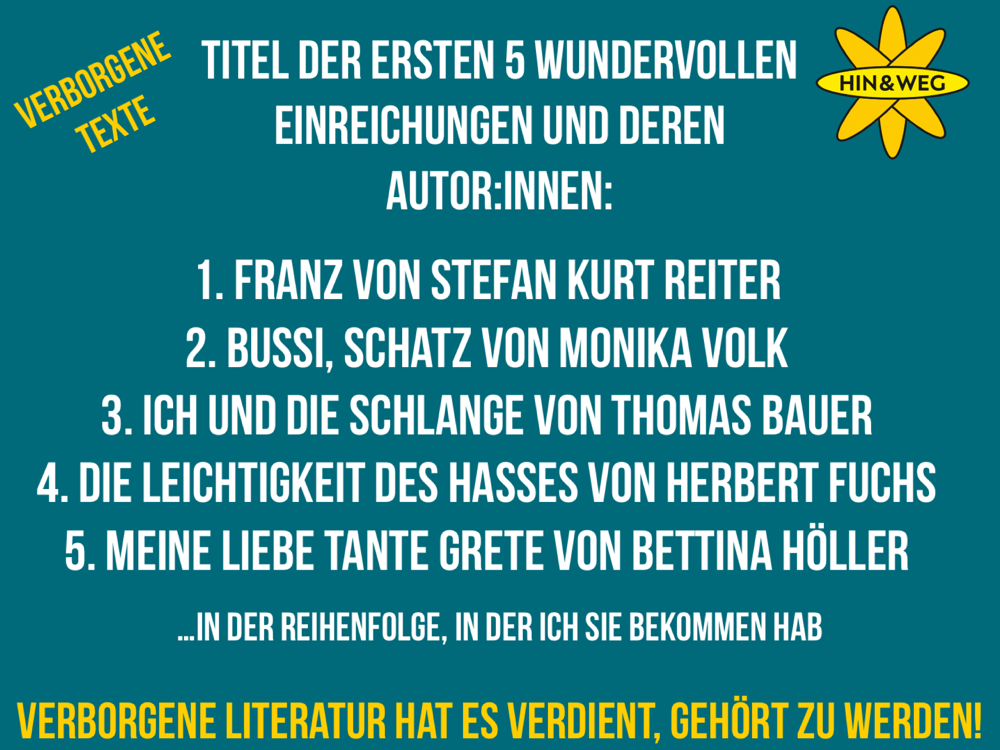 Die Reihenfolge der Aufnahmen richtet sich nach der Reihenfolge, in der die Texte bei mir eingelangt sind.
